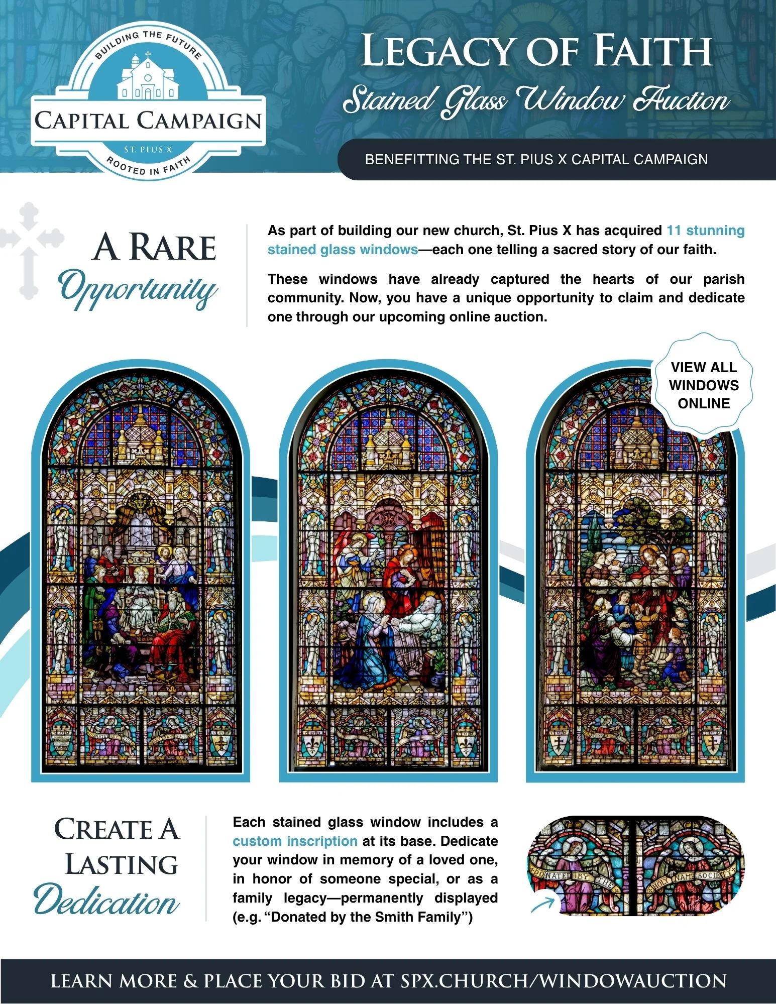These windows have already captured the hearts of our parish community. Now, you have a unique opportunity to claim and dedicate one through our upcoming online auction. This is a once-in-a-generation opportunity to permanently dedicate a sacred work of art in our church.